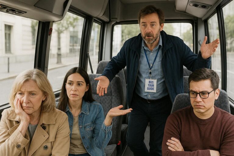 「楽しみにしていたバスツアーだったのに、ガイドが遅刻して行程がズレてしまった…。」